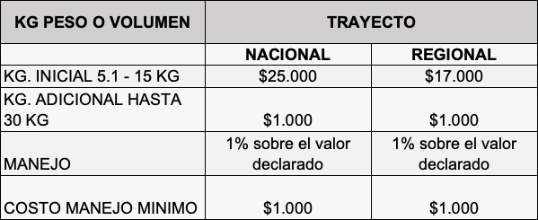 - Aplica para: Envíos individuales con un peso o volumen superior a 5 kilos hasta 30 kilos.